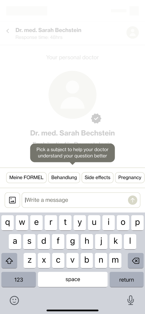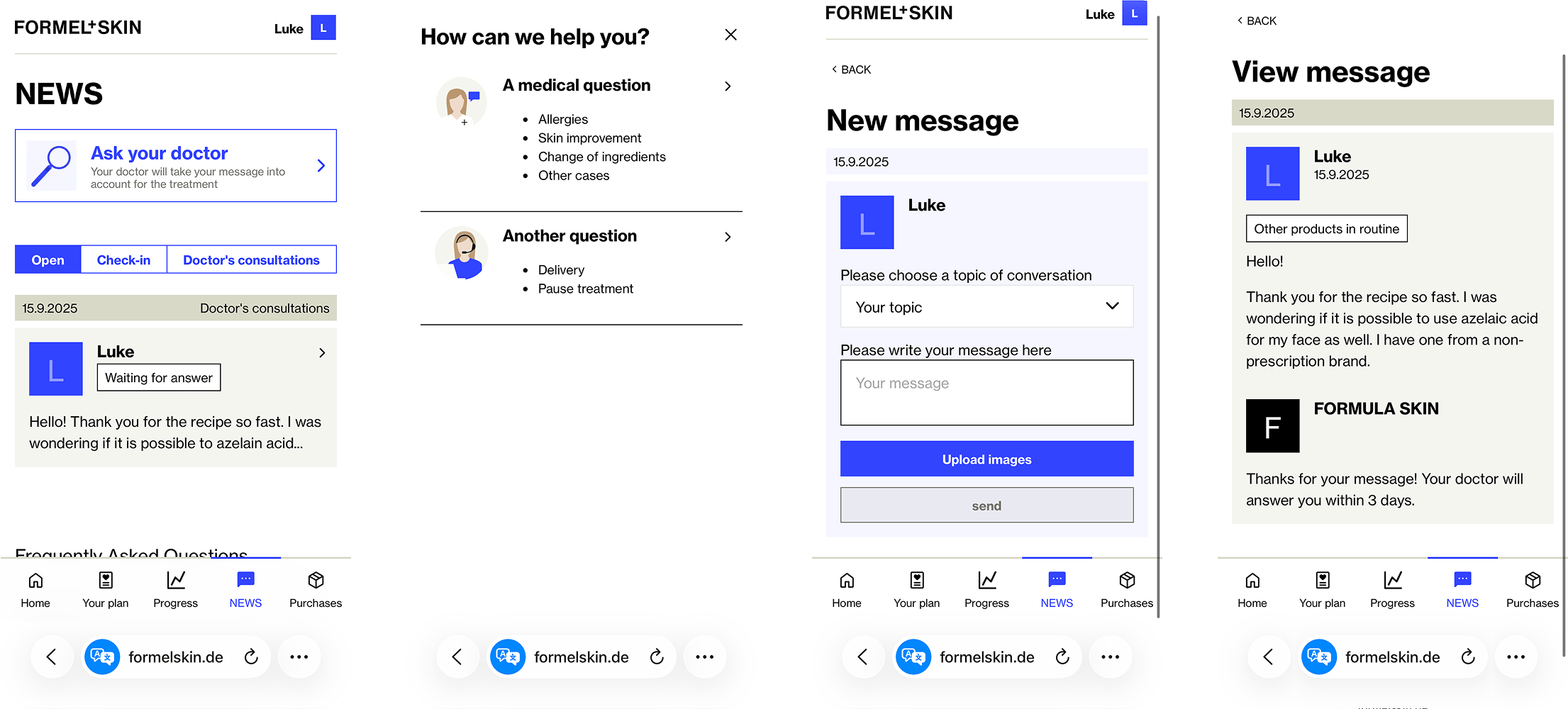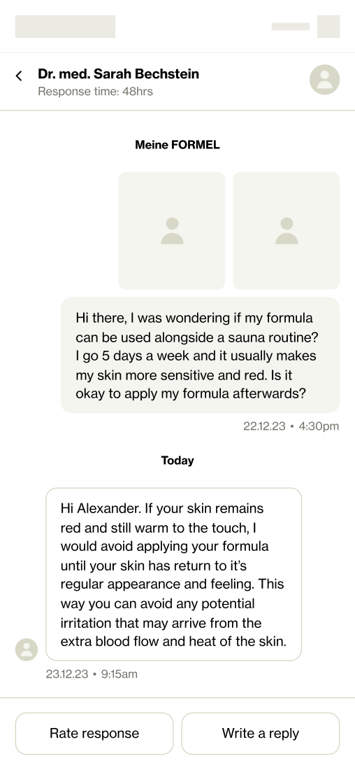 Formel Skin is Germany’s largest digital dermatology service, combining monthly prescription treatments delivered to your home with continuous support from your doctor online. Unlike traditional dermatology, patients can reach their doctor 24/7 for ongoing care.