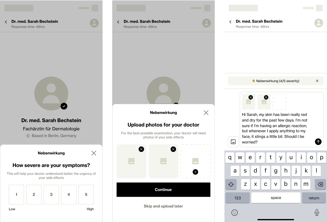 Side effects were one of the most emotional and risky moments in a patient’s journey. For acne especially, an initial “purge” phase often made skin worse before it got better. Patients panicked, questioned their treatment, and many abandoned their subscription altogether.For doctors, side effects also carried medical risk. If a message was miscategorised or missing details like photos, it slowed their ability to reassure patients or adjust treatment safely.To address this, we built a dedicated side-effects flow: