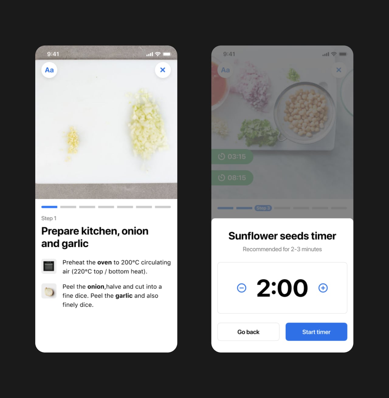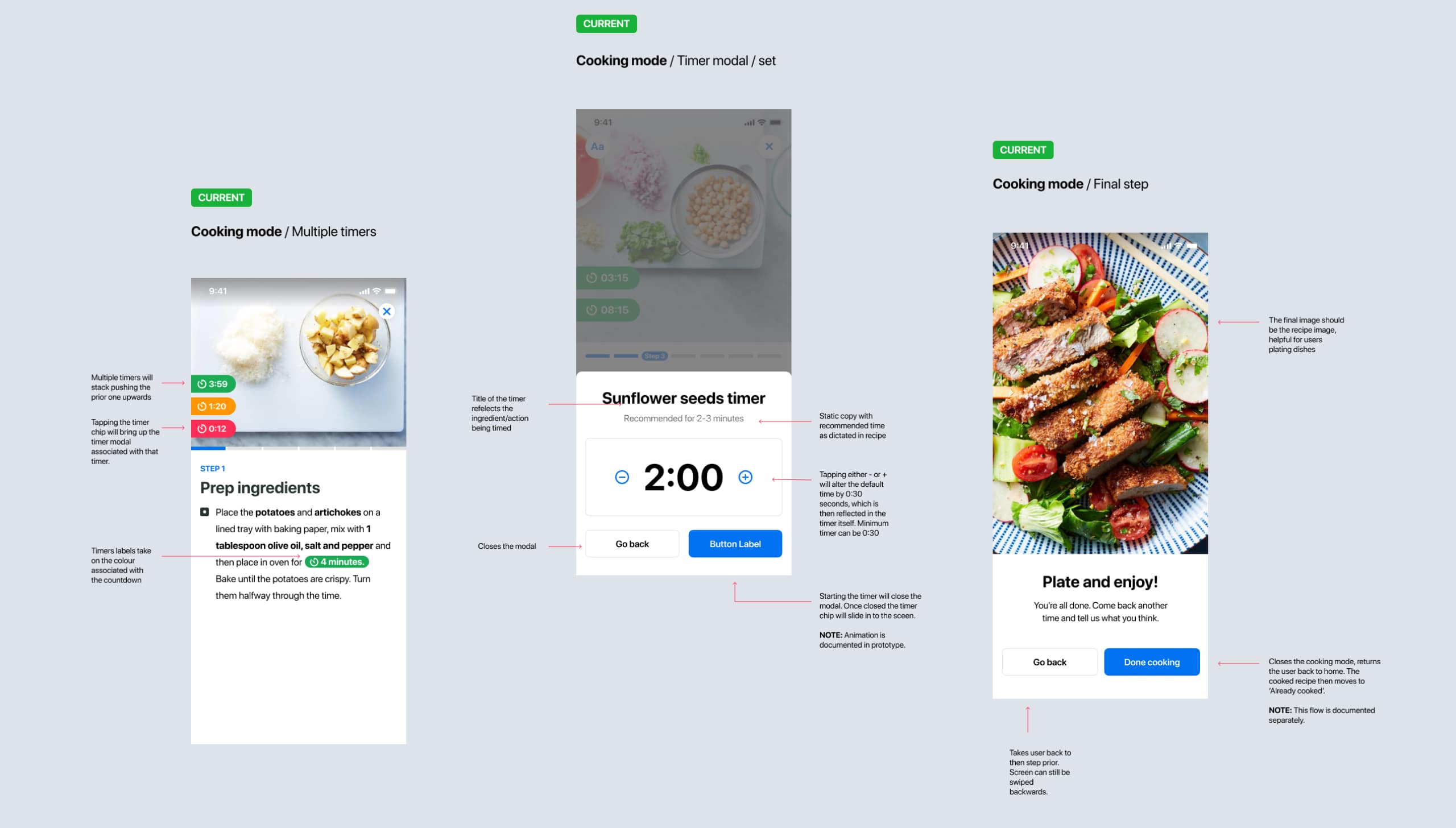 We designed a brand new immersive cooking mode that was gesture driven and more visual. Customers can tap or swipe between steps, use integrated timers for specific recipe instructions and zoom into photos to get close to the detail. We also focused on improving readability of text and making imagery more visible than before.