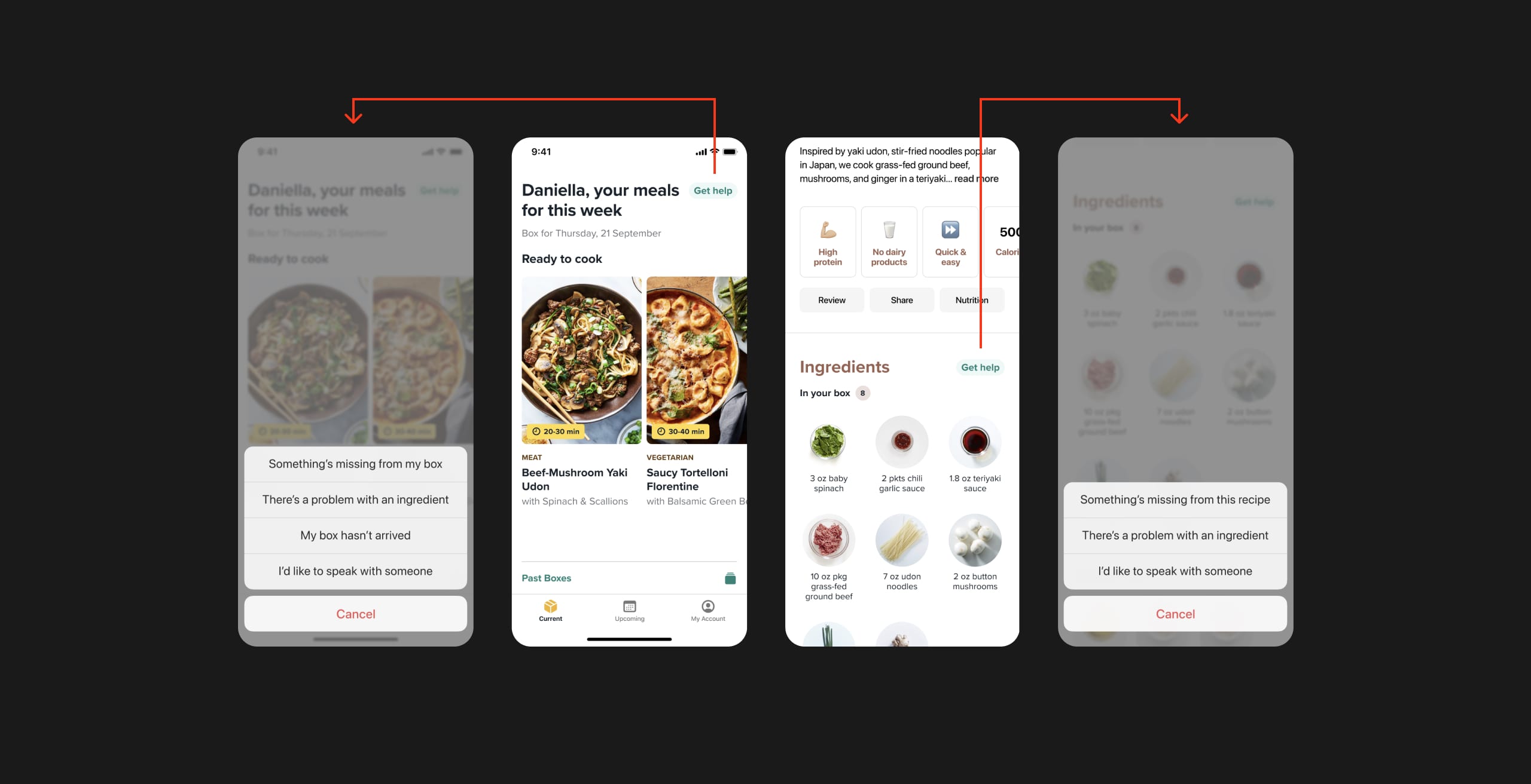 We created two easy entry points for help based on the moments customers tended to notice the problem—on the current box screen and on the recipe detail page in close proximity to ingredient listings. We designed a simple flow that allowed customers to select precisely which ingredient was missing from a specific recipe and report it to customer care without needing to go through any extra chat windows or emails.